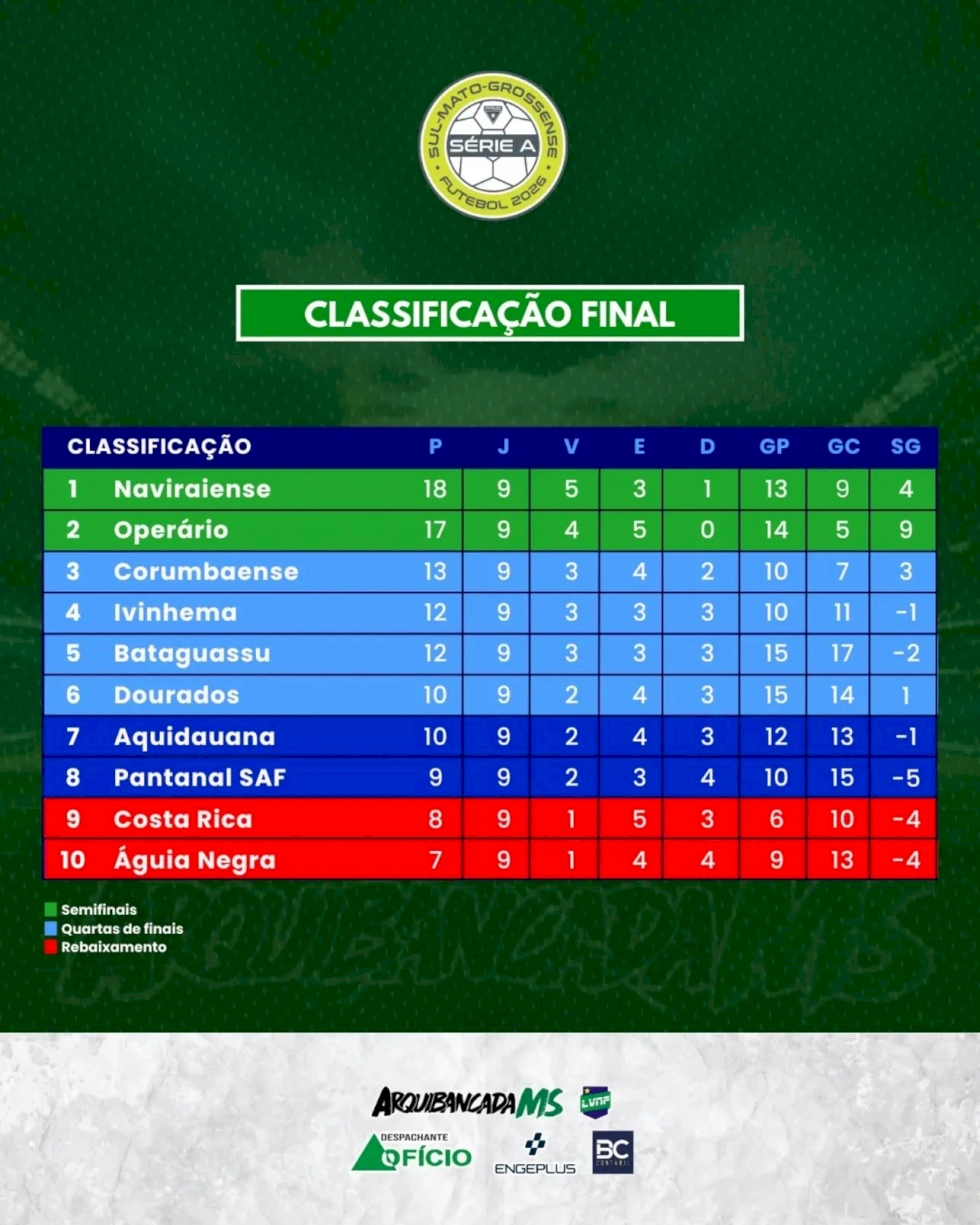 Aquidauana e Pantanal encerraram a participação sem classificação, mas permanecem na elite. Costa Rica e Águia Negra disputarão a Série B de 2027.