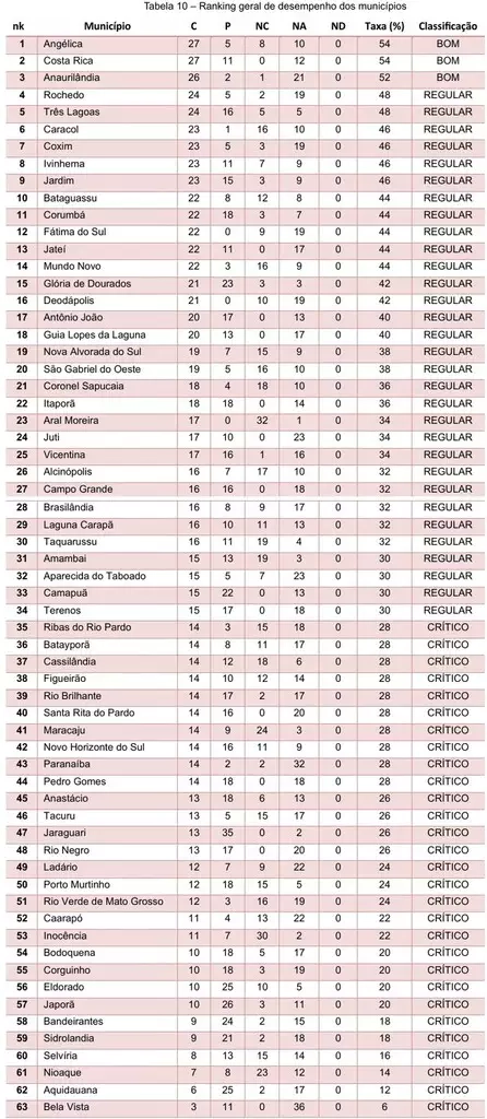 Os dados são da Ratma (Rede de Assistência Técnica para Monitoramento e Avaliação dos Planos Municipais) do TCE. No ranking geral de desempenho, apenas três cidades do Estado apresentam nível 'bom' no cumprimento das metas, com índices entre 52% e 54%. O restante dos municípios, incluindo Campo Grande, oscila entre os níveis regular e crítico. Dezesseis prefeituras sequer enviaram os dados solicitados pela Corte de Contas.