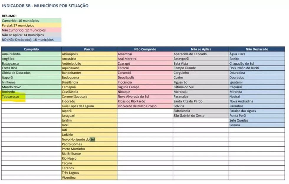 As dez cidades que atingiram a meta de alfabetização são: Anaurilândia, Angélica, Bataguassu, Costa Rica, Glória de Dourados, Itaporã, Ivinhema, Mundo Novo, Rochedo e Taquarussu. Os quatro municípios que bateram a meta de matemática não foram identificados nominalmente no relatório.