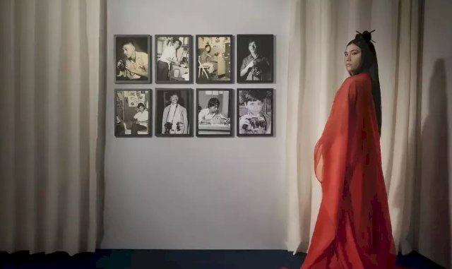 Dentro da exposição, há uma instalação que funciona como um estúdio aberto ao público — câmeras, rolos de negativo, equipamentos para foto 3x4, álbuns de família.