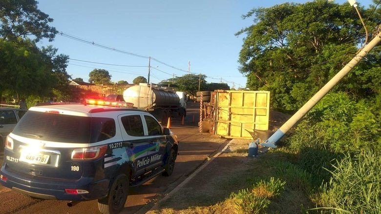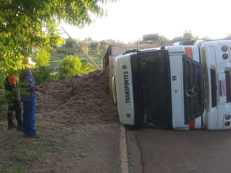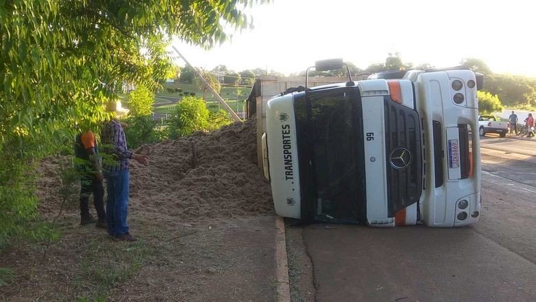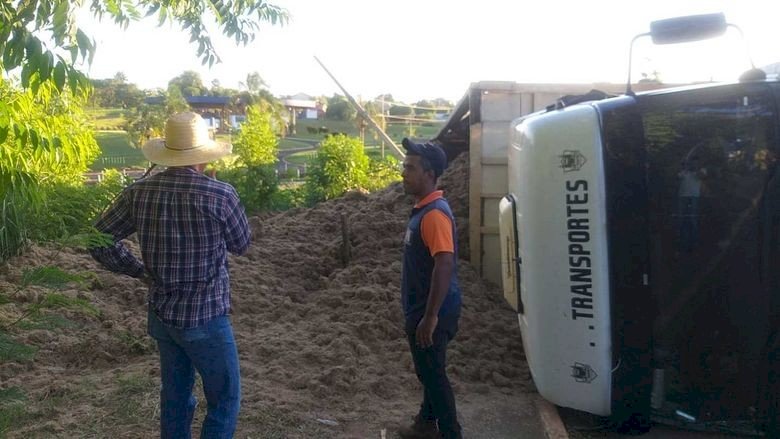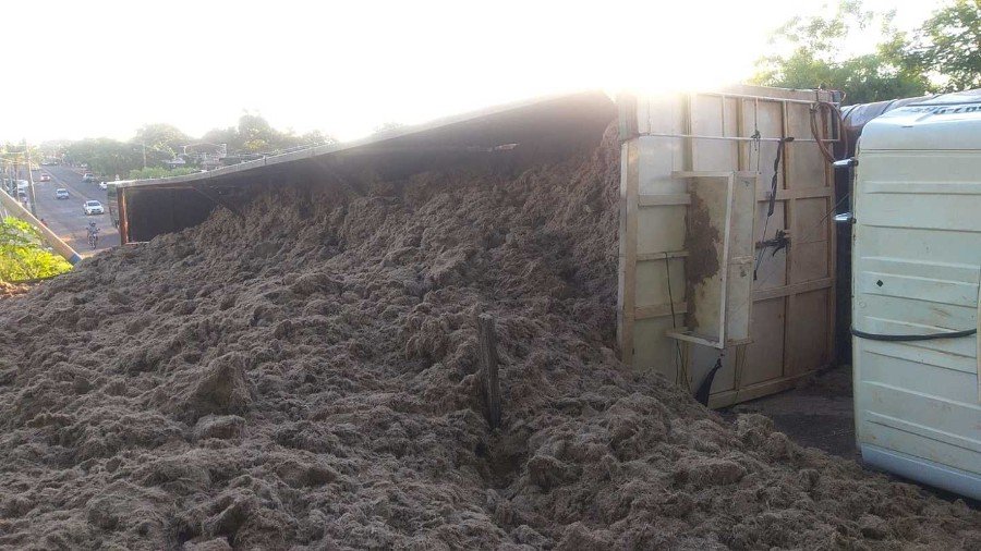 Motorista sai ileso após tombar carreta com bagaço de cana em Glória de Dourados