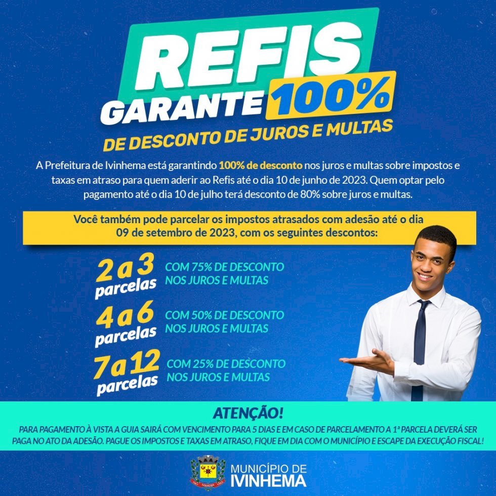 A prefeitura Municipal de Ivinhema esta garantindo 100% de desconto nos juros e multas sobre impostos taxas em atraso para aderir ao refis até o dia 10 de junho de 2023.