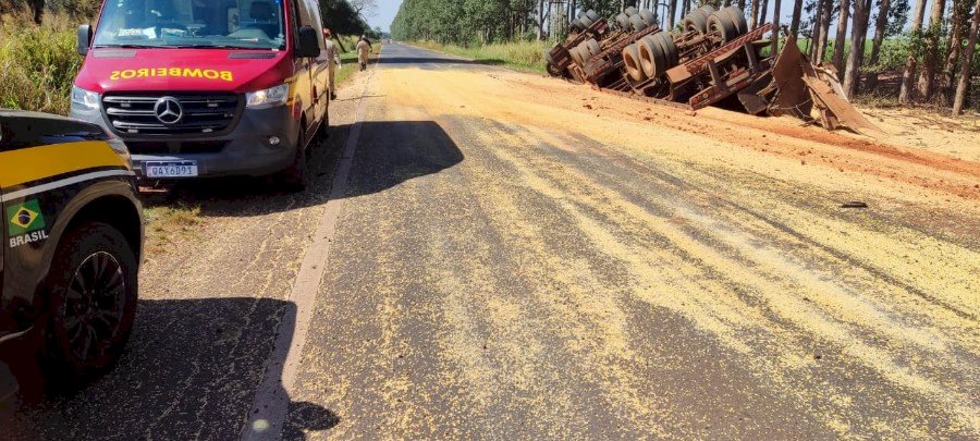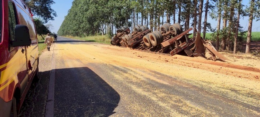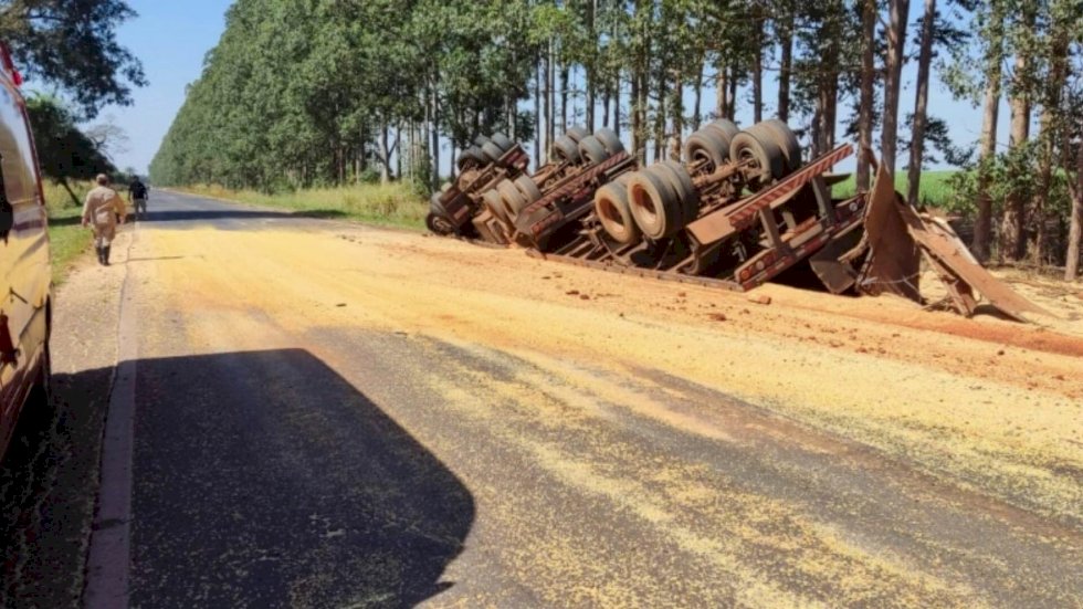 O motorista de uma carreta foi atendido com ferimentos leves após tombar a carreta que conduzia na BR-376, entre Ivinhema e Deodápolis, na manhã desta terça-feira (23).
