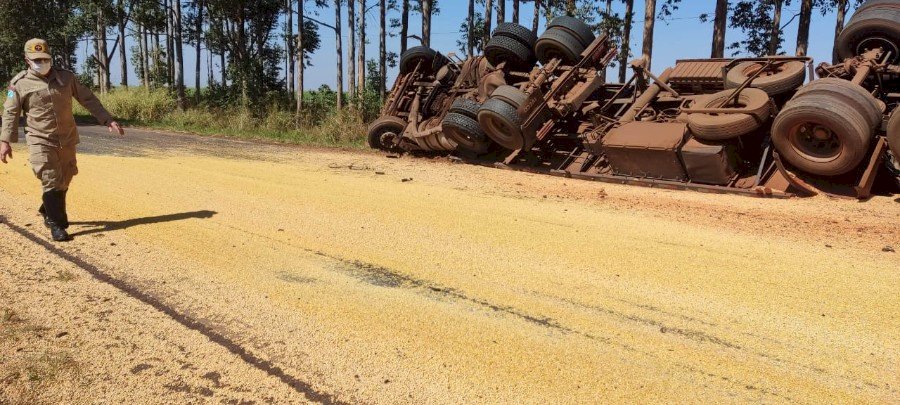 A carreta estava carregada com soja. A carga ficou espalhada na pista.
