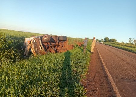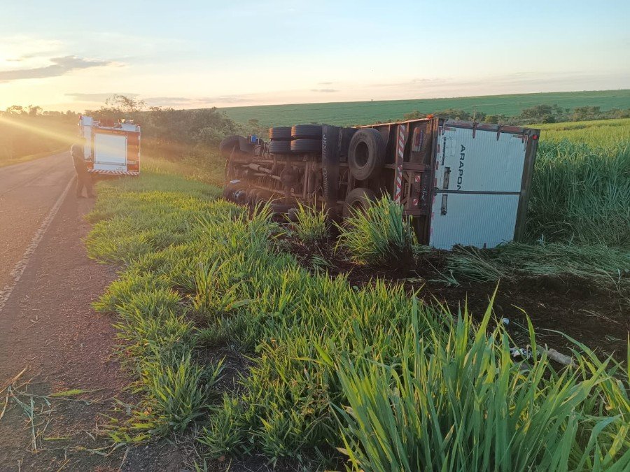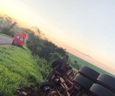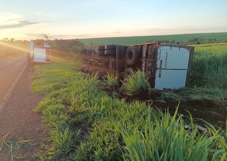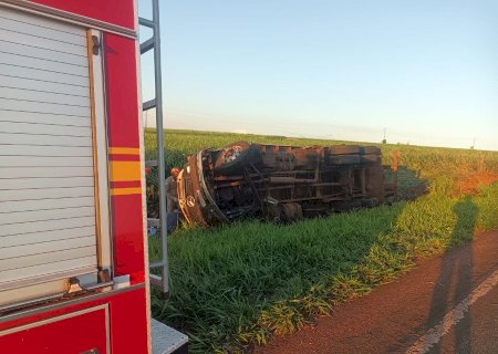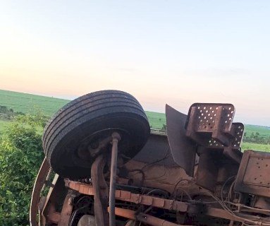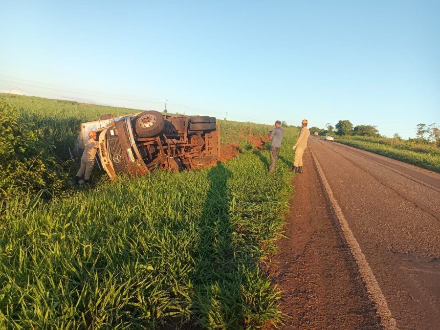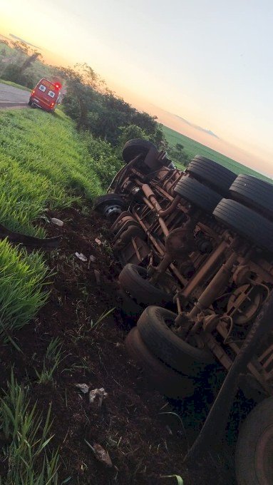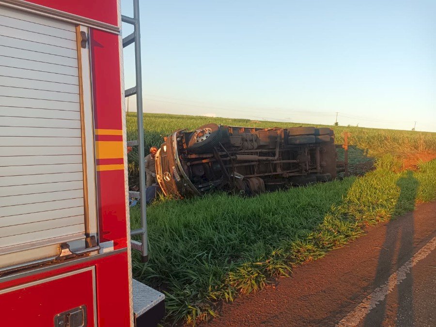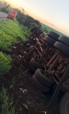 Entre Deodápolis e Ivinhema pneu estoura e caminhão tomba na BR-376, próximo ao pesqueiro da Nina