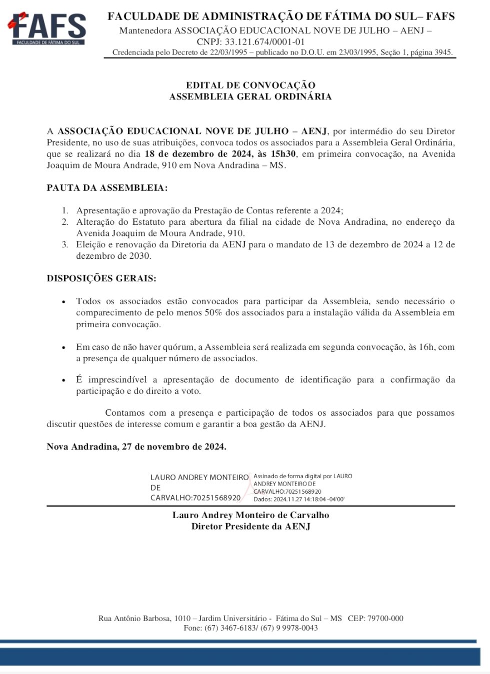 EDITAL DE CONVOCAÇÃO ASSEMBLEIA GERAL ORDINÁRIA Associação Educacional Nove de Julho - AENJ