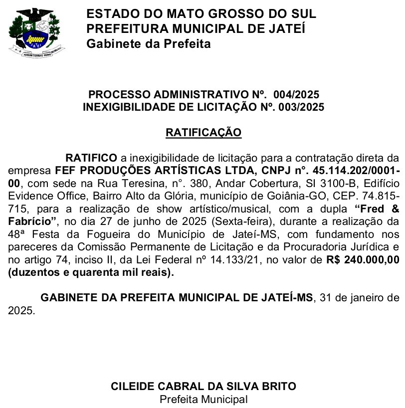 A contratação do show foi realizada por meio do Processo Administrativo nº 004/2025 e Inexigibilidade de Licitação nº 003/2025, com a empresa FEF Produções Artísticas LTDA, no valor de R$ 240.000,00 (duzentos e quarenta mil reais). A medida foi ratificada pela prefeita Cileide Cabral da Silva Brito (PSDB).