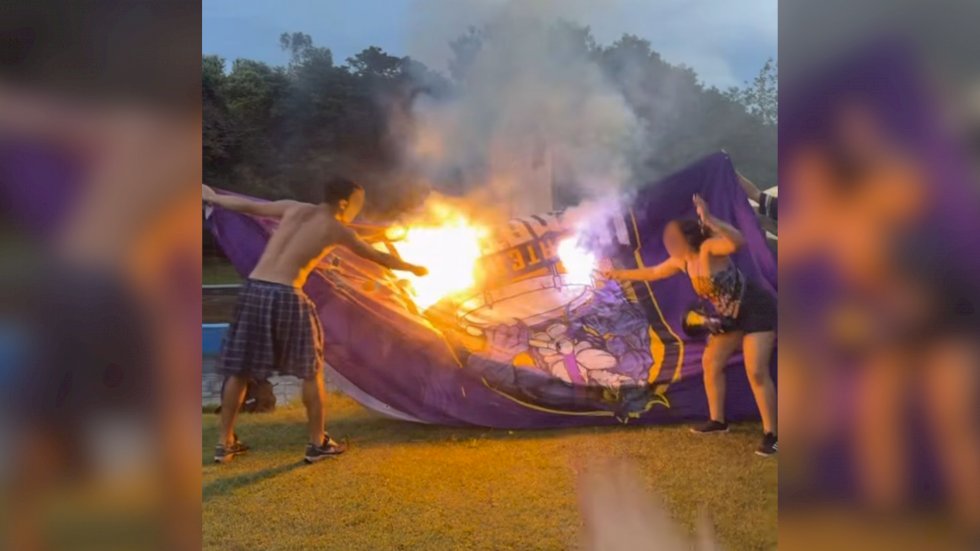 Nas imagens, dois rapazes seguram as extremidades da bandeira, enquanto uma jovem acende um artefato e começa a queimar o tecido. No entorno, outros acadêmicos, aos gritos, chamam os alunos da particular de “burros' e os mandam “tomar no c*'.