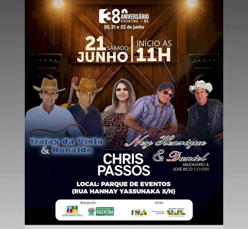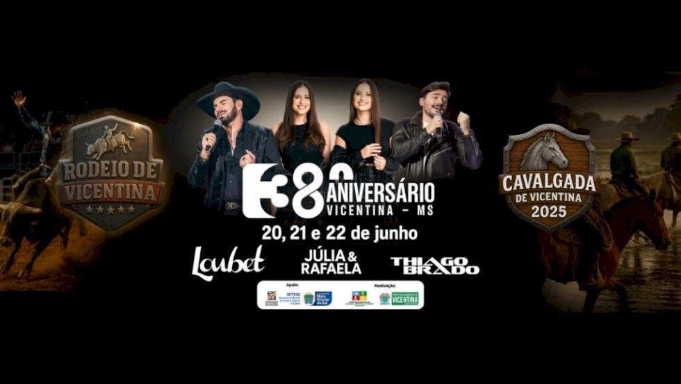 A festa dos 38 anos de Vicentina será realizada nos dias 20, 21 e 22 de junho, com rodeio toda as noites. Na sexta (20), a atração musical é o show do sertanejo Loubet. No dia 21, sábado, acontece a cavalgada, queima do alho (almoço caipira) e os shows dos artistas locais no parque de eventos, sendo que a noite a dupla fenômeno feminina Júlia e Rafaela se apresenta depois do rodeio. Thiago Brado encerra os shows no domingo, 22.