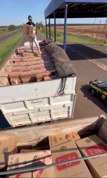 Em vistoria ao caminhão, foram encontradas várias caixas de cigarros de origem estrangeira.
