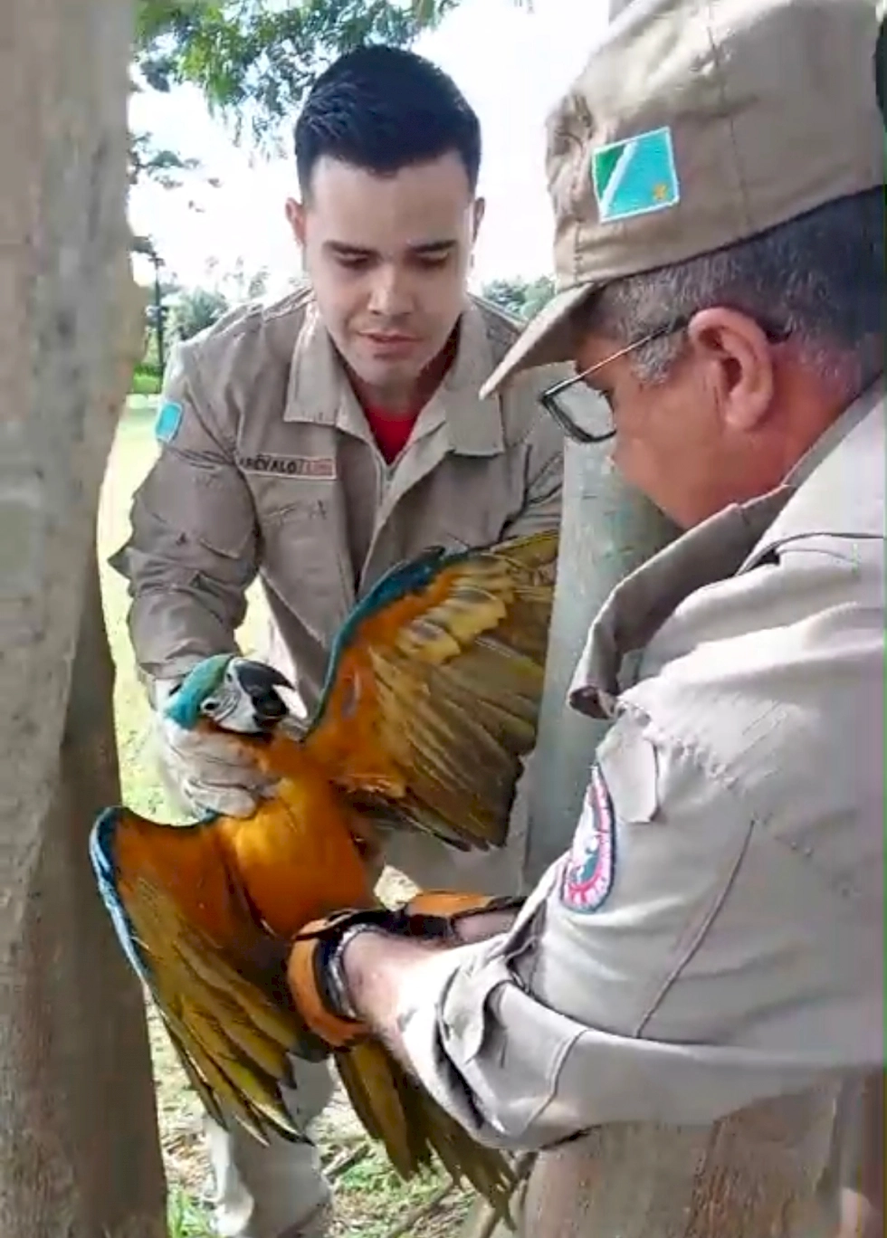 Na manhã desta terça-feira (10) o Corpo de Bombeiros de Ivinhema realizou o resgate de uma arara-azul.