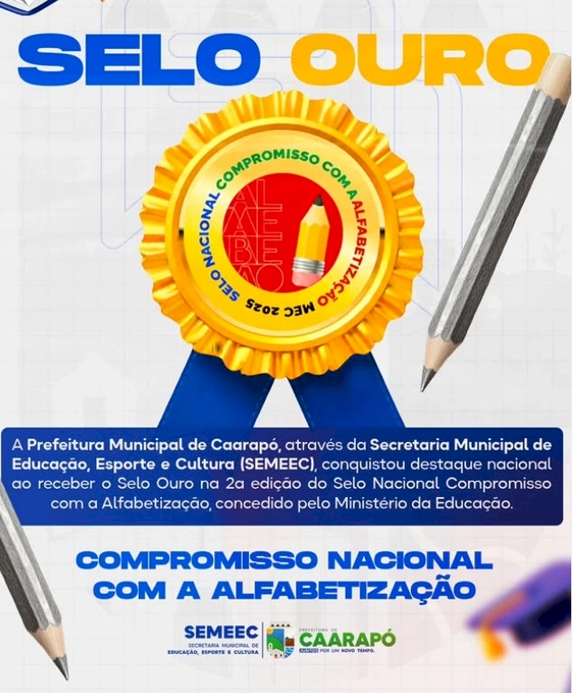 A Prefeitura de Caarapó, por meio da Secretaria Municipal de Educação, Esporte e Cultura (SEMEEC), alcançou reconhecimento nacional ao receber o Selo Ouro na 2ª edição do Selo Nacional Compromisso com a Alfabetização, concedido pelo Ministério da Educação (MEC). O prêmio integra o programa Compromisso Nacional Criança Alfabetizada (CNCA), que tem como meta assegurar que todas as crianças estejam alfabetizadas até o final do 2º ano do Ensino Fundamental.