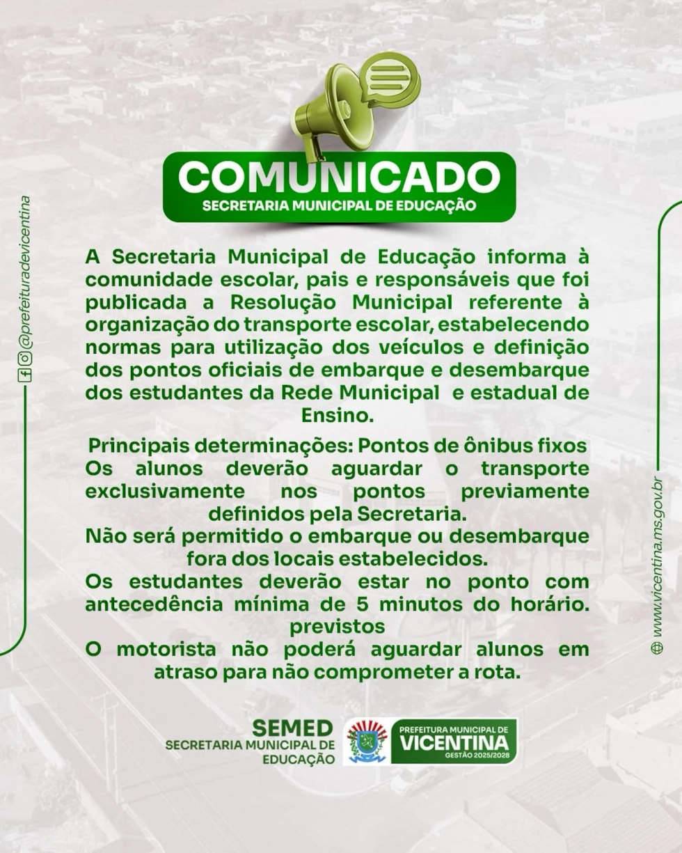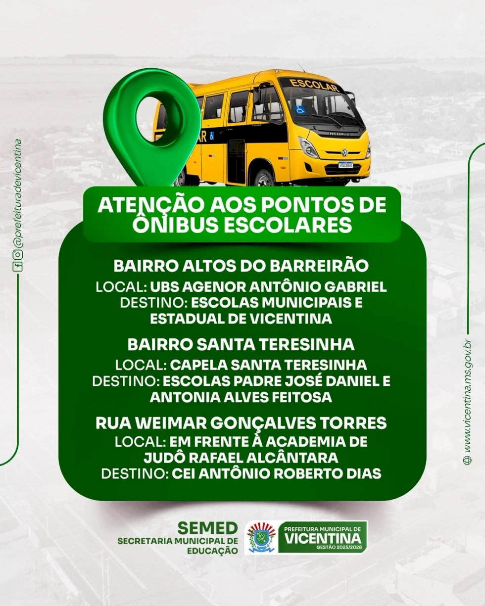 A Secretaria Municipal de Educação de Vicentina reforça que os alunos devem aguardar o transporte apenas nos pontos oficiais e chegar com antecedência.