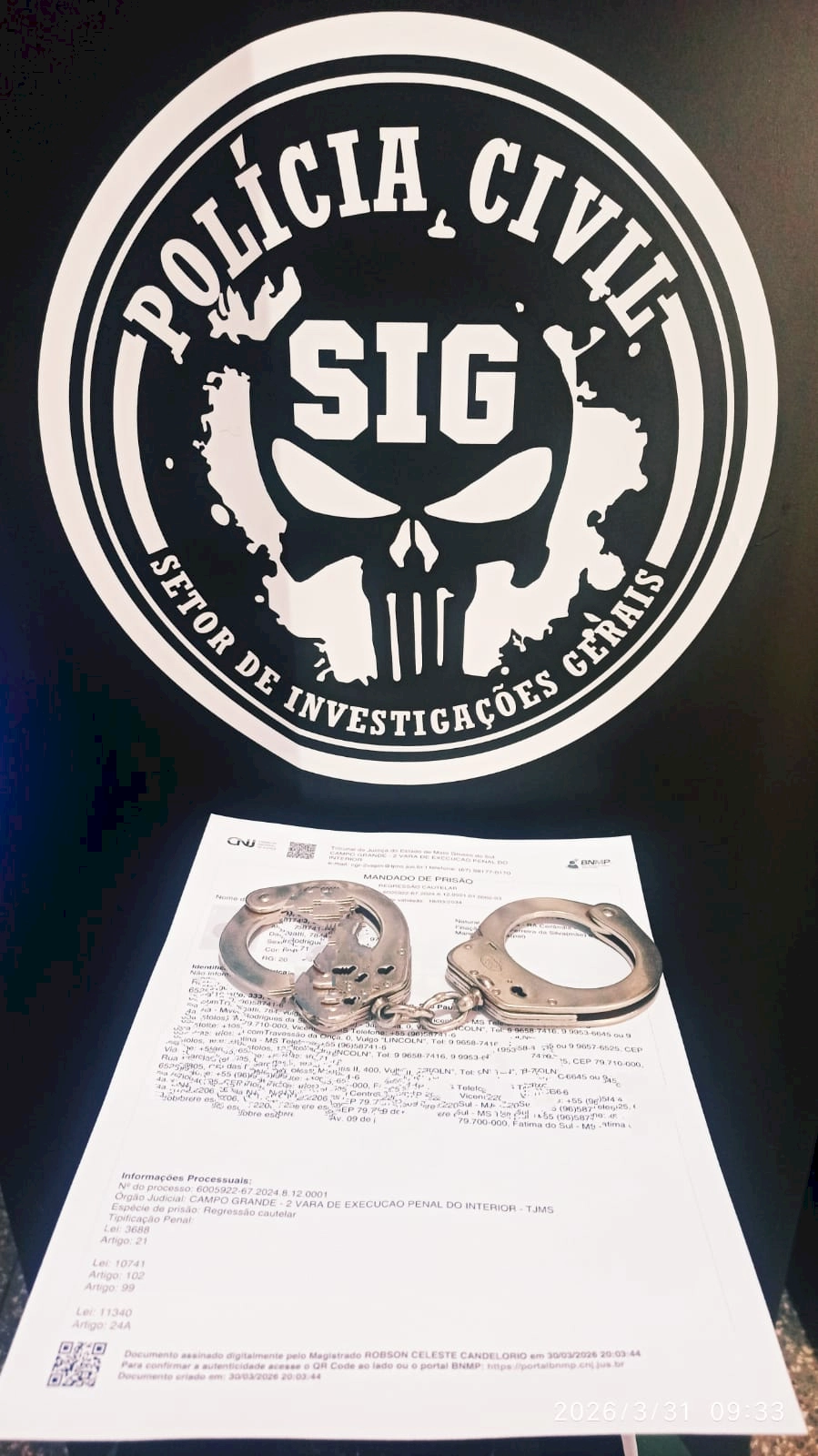 A Polícia Civil de Mato Grosso do Sul, por meio do Setor de Investigações Gerais (SIG) da 1ª Delegacia de Polícia de Fátima do Sul, cumpriu, na manhã desta terça-feira (31/03/2026), mais um mandado de prisão expedido pela 2ª Vara de Execução Penal do Interior, da Comarca de Campo Grande/MS.