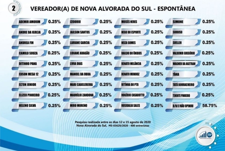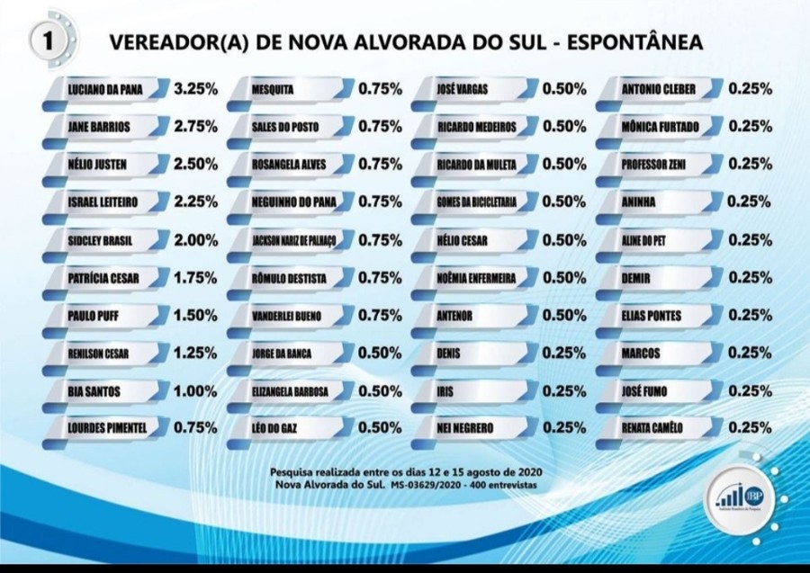 O Instituto IBP quis saber da população de forma espontânea os nomes que deveriam ser candidatos a vereadores no pleito de 2020 em Nova Alvorada do Sul-MS. Veja todos o lembrados pelos 400 moradores entrevistados no município: