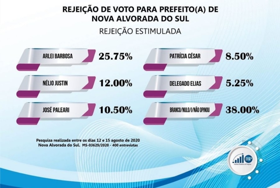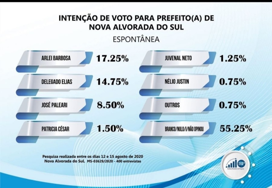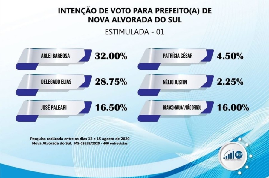 O Instituto IBP colheu dados da população de Nova Alvorada do Sul de forma espontânea a respeito do pleito de 2020. Os dados estão de acordo com as resoluções do TSE. O quadro mostra empate técnico entre o Prefeito Arlei e o Delegado Elias.