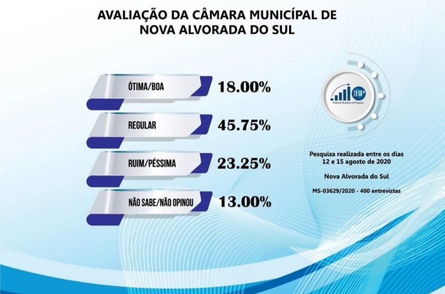 A pesquisa colheu dados da opinião pública sobre o que pensa os entrevistados sobre a atuação dos vereadores e o desempenho da Câmara Municipal no município de Nova Alvorada do Sul.