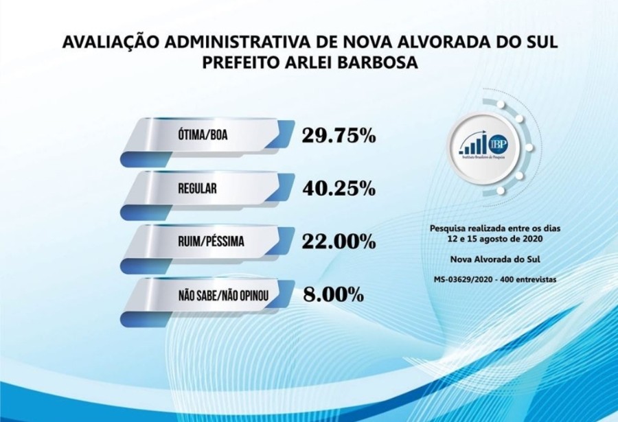 A aliação do prefeito de Nova Alvorada do Sul-MS, Arlei Barbosa é baixa. Veja os números; ótima/boa 29,75%, regular 40,25% e ruim/péssima 22%. Não souberam ou não opinaram, 8%.